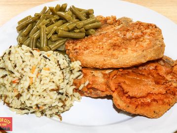 2 juicy tender pork chops fried, smothered or one of each! also comes with 2 sides and a corn bread.